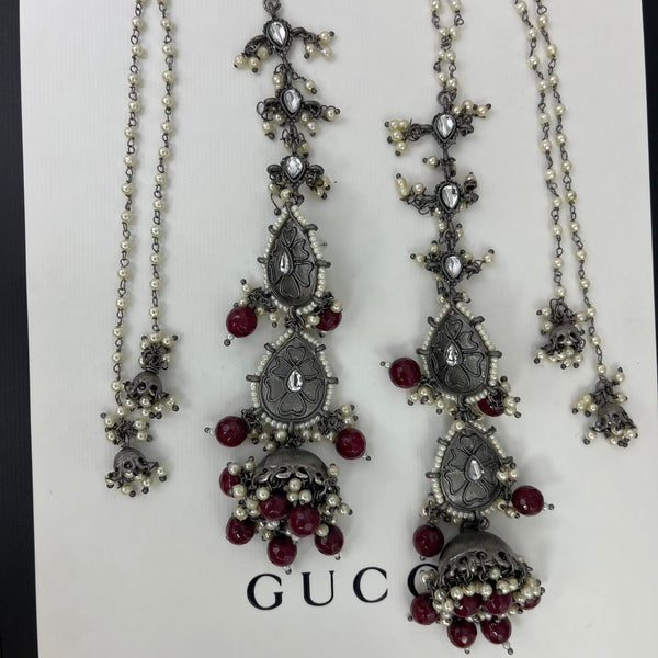 Oxidized statement earrings with pearl drops that go over the ear