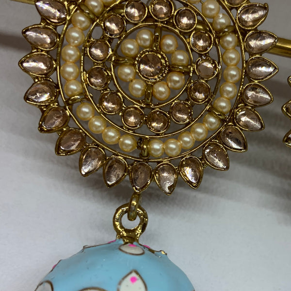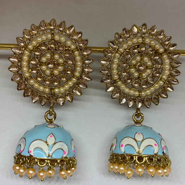 Lightweight jhumki with stones and pearls with light blue meenakari