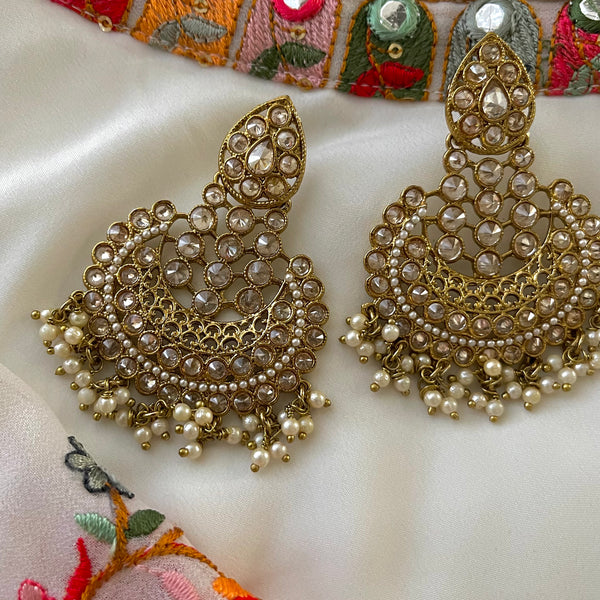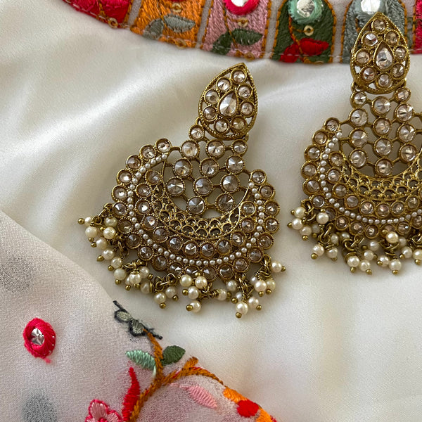 Lightweight earrings with polki stone work and pearl detailing set in an antique tone