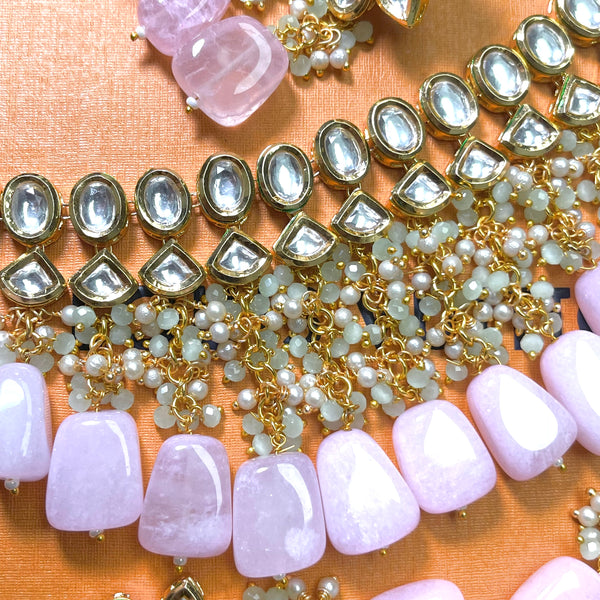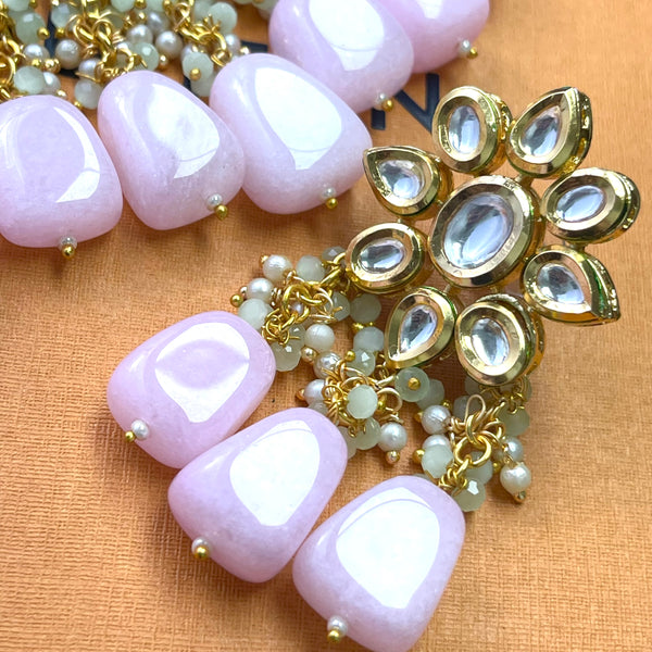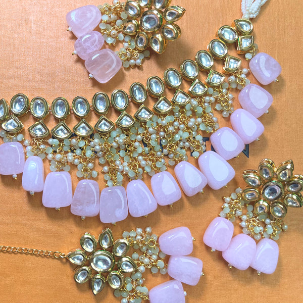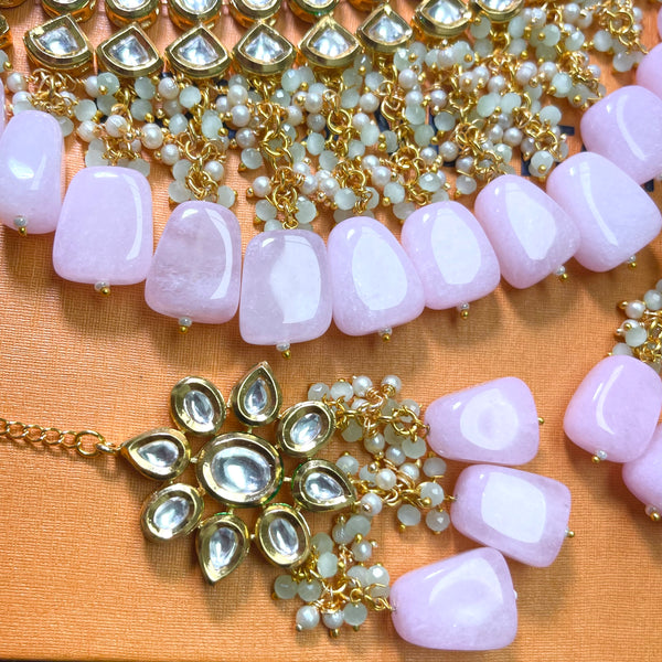 Pink kundan necklace with earrings and tikka